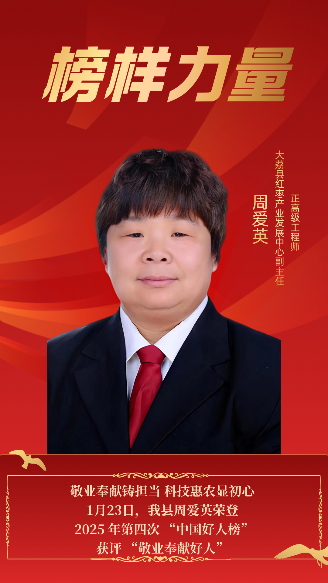 1月23日,2025年第四次“中国好人榜”发布仪式在四川省宜宾市举行,我县周爱英荣登2025年第四次“中国好人榜”,获评“敬业奉献好人”。