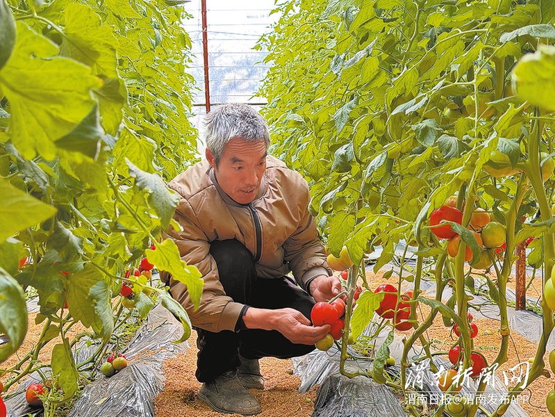 2月1日,在大荔县冯村镇新庄村的设施大棚里,翠绿的藤蔓之间,红彤彤的西红柿缀满枝头,个个饱满鲜亮。兰国娃穿梭在大棚中,一边熟练地整理枝叶,一边热情地向采摘者介绍:“这是新品种草莓西红柿,口感沙甜。旁边大棚种的是普罗旺斯西红柿,大家可以先品尝品尝。”