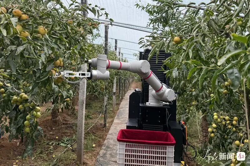 据科研专家介绍,二代“蓝侠”机器人依托多光谱成像技术及自主训练的人工智能视觉模型,能在复杂背景下识别被枝叶遮挡的隐蔽果实;仿生型柔性多指夹爪可自适应果实大小形状;带力矩反馈的6DOF多自由度协作机械臂搭配手眼协同算法,能灵活精准接近目标果实;自主设计的多地形底盘车可在1-2垄间距的场地自由移动,适配大荔县42万亩冬枣园的精细化管理需求。
