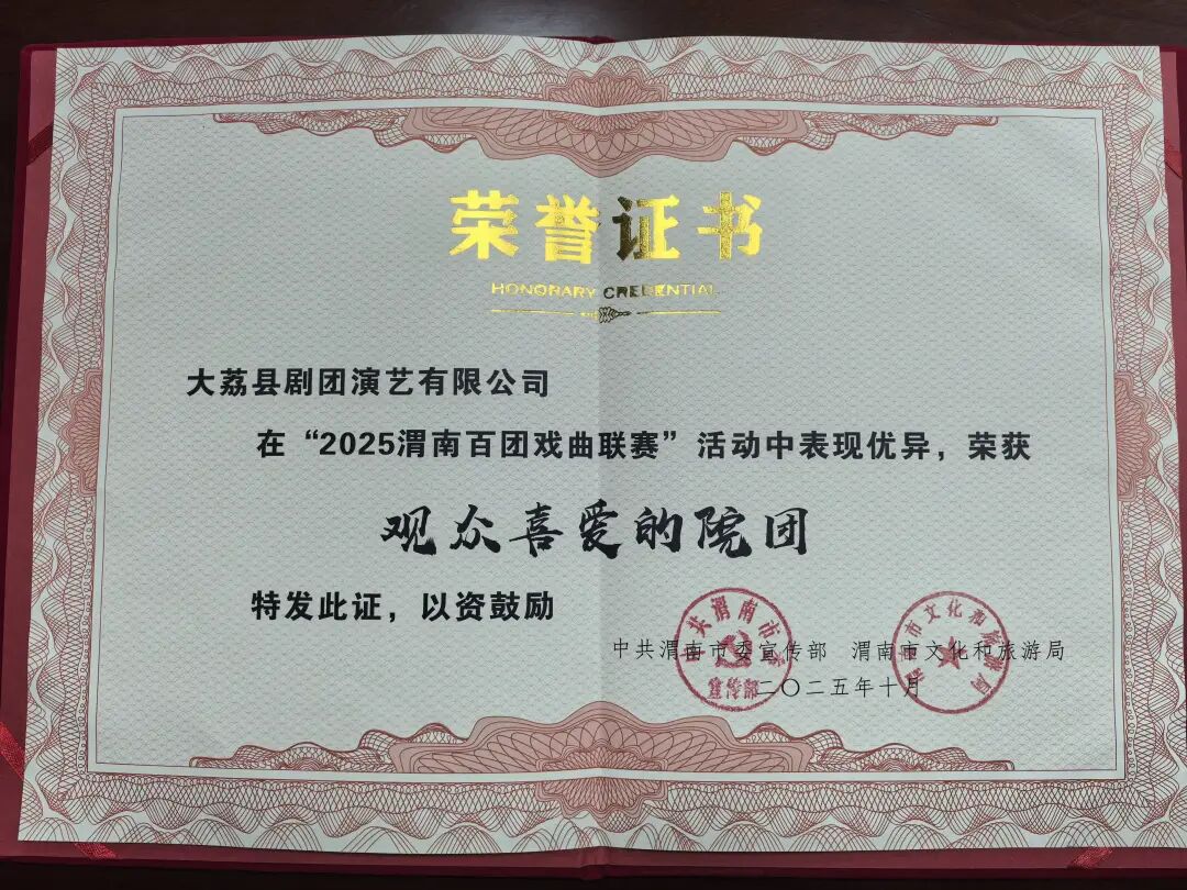 由中共渭南市委宣传部等多部门联合主办的“2025渭南百团戏曲联赛”圆满落幕。大荔县剧团演艺有限公司凭借扎实功底与精彩演绎,从众多参赛院团中脱颖而出,斩获2025渭南百团戏曲联赛“观众最喜爱的院团”荣誉。剧团青年演员俱婷、党洁、王团同步荣获“观众喜爱的演员”称号,尽显秦腔艺术传承活力。