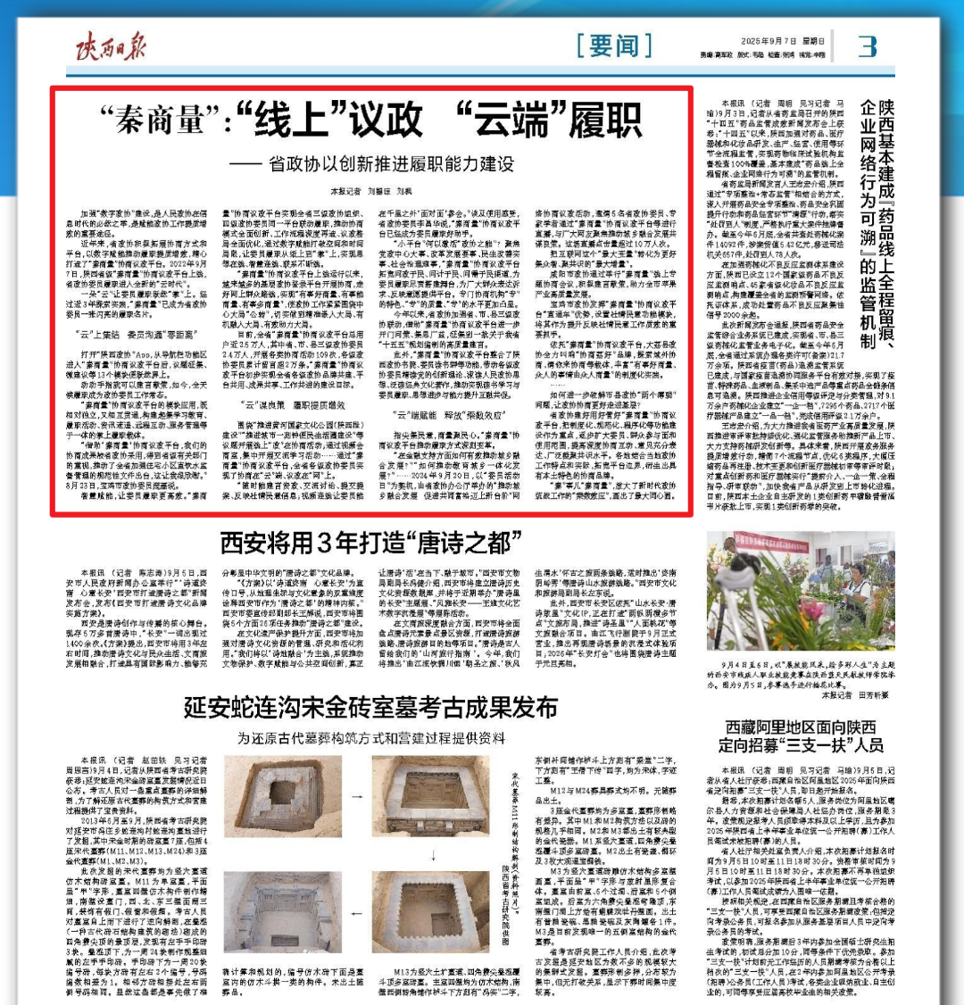 《陕西日报》9月7日报道 加强“数字政协”建设,是人民政协在信息时代的必然之举,是赋能政协工作提质增效的重要途径。 近年来,省政协积极拓展协商方式和平台,以数字赋能推动履职提质增效,精心打造了“秦商量”协商议政平台。2022年9月7日,陕西省级“秦商量”协商议政平台上线,省政协委员履职进入全新的“云时代”。 一朵“云”让委员履职跃然“掌”上。经过近3年探索实践,“秦商量”已成为省政协委员一张闪亮的履职名片。 “云”上集结 委员沟通“零距离” 打开“陕西政协”App,从导航栏功能区进入“秦商量”协商议政平台后,议题征集、微建议等13个模块便跃然屏上。 动动手指就可以建言献策,如今,全天候履职成为政协委员工作常态。 “秦商量”协商议政平台的模块应用,既相对独立,又相互贯通,构建起集学习教育、履职活动、资讯速递、远程互动、服务管理等于一体的掌上履职载体。 “借助‘秦商量’协商议政平台,我们的协商成果被省政协采用,得到省级有关部门的重视,推动了全省加强住宅小区直饮水监督管理的规范性文件出台,这让我很欣慰。”8月23日,宝鸡市政协委员庞磊说。 智慧赋能,让委员履职更高效。“秦商量”协商议政平台实现全省三级政协组织、四级政协委员同一平台联动履职,推动协商模式全面创新、工作流程深度再造、议政格局全面优化,通过数字赋能打破空间和时间局限,让委员履职从纸上到“掌”上,实现思想在线、智慧连线、联系不断线。 “秦商量”协商议政平台上线运行以来,越来越多的基层政协登录平台开展协商,走好网上群众路线,实现“有事好商量、有事能商量、有事多商量”,使政协工作紧紧围绕中心大局“公转”,切实做到精准嵌入大局、有机融入大局、有效助力大局。 目前,全省“秦商量”协商议政平台总用户近2.5万人,其中省、市、县三级政协委员2.4万人,开展各类协商活动109次,各级政协委员累计留言超2万条。“秦商量”协商议政平台初步实现全省各级政协品牌共建、平台共用、成果共享、工作共进的建设目标。 “云”谋良策 履职提质增效 围绕“推进黄河国家文化公园(陕西段)建设”“推进城市一刻钟便民生活圈建设”等议题开展线上“政”在协商活动;通过视频会商室,集中开展交流学习活动……通过“秦商量”协商议政平台,全省各级政协委员实现了协商在“云”端、议政在“网”上。 “随时能建言资政、交流讨论、提交提案、反映社情民意信息;视频连线让委员能在千里之外‘面对面’参会。”谈及使用感受,省政协委员李昌华说,“秦商量”协商议政平台已经成为委员履职好助手。 “小平台”何以激活“政协之能”?聚焦党政中心大事、改革发展要事、民生改善实事、社会治理难事,“秦商量”协商议政平台拓宽问政于民、问计于民、问需于民渠道,为委员履职尽责搭建舞台,为广大群众表达诉求、反映意愿提供平台。专门协商机构“专”的特色、“专”的质量、“专”的水平更加凸显。 今年以来,省政协加强省、市、县三级政协联动,借助“秦商量”协商议政平台进一步开门问策、集思广益,征集到一批关于我省“十五五”规划编制的高质量建言。 此外,“秦商量”协商议政平台整合了陕西政协书院、委员读书群等功能,带动各级政协委员精读党的创新理论、深读人民政协思想、泛读经典文化著作,推动实现读书学习与委员履职、思想进步与能力提升互融共促。 “云”端赋能 释放“乘数效应” 指尖集民意,商量聚民心。“秦商量”协商议政平台推动履职方式深刻变革。 “在金融支持方面如何有效推动城乡融合发展?”“如何推动教育城乡一体化发展?”……2024年9月20日,以“委员活动日”为契机,由省政协办公厅举办的“推动城乡融合发展 促进共同富裕迈上新台阶”网络协商议政活动,邀请5名省政协委员、专家学者通过“秦商量”协商议政平台等进行直播,与广大网友聚焦推动城乡融合发展共谋良策。这场直播点击量超过10万人次。 把互联网这个“最大变量”转化为更好集众智、聚共识的“最大增量”。 咸阳市政协通过举行“秦商量”线上专题协商会议,积极建言献策,助力全市苹果产业高质量发展。 宝鸡市政协发挥“秦商量”协商议政平台“直通车”优势,设置社情民意功能模块,将其作为提升反映社情民意工作质效的重要抓手。 依托“秦商量”协商议政平台,大荔县政协全力叫响“协商荔好”品牌,探索域外协商、请你来协商等载体,丰富“有事好商量、众人的事情由众人商量”的制度化实践。 …… 如何进一步破解市县政协“两个薄弱”问题,让政协协商更好走进基层? 省政协建好用好管好“秦商量”协商议政平台,把制度化、规范化、程序化等功能建设作为重点,逐步扩大委员、群众参与面和使用范围,提高深度协商互动、意见充分表达、广泛凝聚共识水平。各地结合当地政协工作特点和实际,拓宽平台边界,衍生出具有本土特色的协商品牌。 “秦”事儿“秦商量”,放大了新时代政协统战工作的“乘数效应”,画出了最大同心圆。