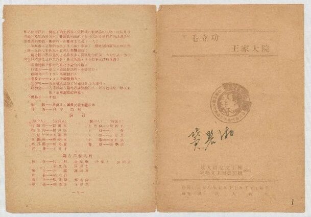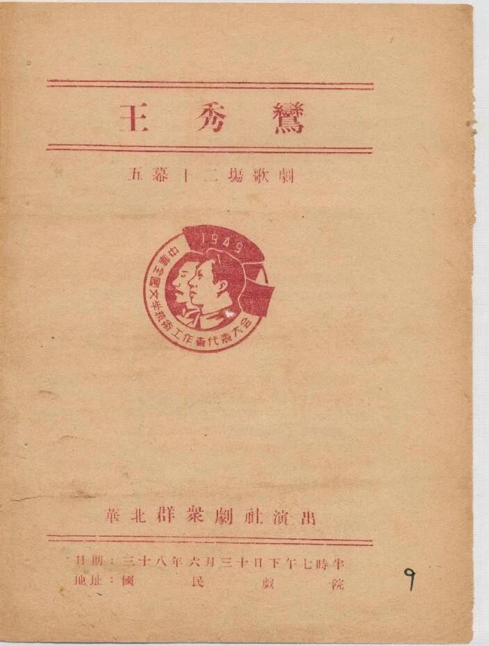△1949年6月30日中华全国文学艺术工作者代表大会期间演出的《王秀鸾》歌剧。戴碧湘参加第一次文代会期间所使用的节目单均宽26.6厘米,长37.4厘米,纸张已泛黄,但品相完好,充分体现了他保存的细心。节目单对折,套红印刷,封面印有第一次文代会会徽,印有演出节目名称、演出单位及演出时间,封底有演员名单、舞台工作人员名单等信息,部分节目单夹有折页,登载有作者创作谈、演出单位和剧情介绍等内容。戴碧湘,原名戴自诚,1918年生于四川省安岳县,1935年开始文艺和戏剧创作活动,与友人合编《孤灯》副刊,后又创办《诗风》半月刊和《四川文学》月刊,参加明天剧社、国防剧社,开展戏剧创作活动。1936年参加抗日救亡活动,1938年加入中国共产党。1946年1月起先后任辽西文工团(后改为辽吉军区文工团)、七纵文工团、四野44军文工团团长。1949年,戴碧湘作为代表参加第一次文代会,后任中南军区部队艺术剧院政委兼党委书记、广州军区文化部副部长等职,曾荣获三级独立自由勋章、二级解放勋章。新中国成立前夕,在中国共产党的倡议和号召下,各路文艺队伍会师北平,召开了第一次文代会,并成立了全国性的文艺组织——中华全国文学艺术界联合会。1949年2月,中共中央决定召开全国文协理事会与各解放区文协联席会议,筹备新的全国文协大会。此时,北平刚刚和平解放,新中国成立的诸项具体事务正在紧锣密鼓地筹备中。3月22日,中华全国文艺协会在北平的总会理监事及华北文协理事在北京饭店举行联席会议,决定召开第一次文代会,当场推选筹委会,于3月24日举行第一次筹委会议。此后,筹委会多次召开会议,讨论第一次文代会工作计划以及代表大会的代表产生办法等问题。1949年7月2日,第一次文代会在北平隆重召开,来自平津代表第一团、平津代表第二团、华北代表团、西北代表团、华东代表团、东北代表团、华中代表团、部队代表团、南方代表第一团、南方代表第二团的约824名(实际报到约650名)代表出席会议。7月6日,毛泽东亲临大会讲话,向代表们表示欢迎。在讲话中他强调指出:“你们都是人民所需要的人,你们是人民的文学家、人民的艺术家或者是人民的文学艺术工作者的组织者。”“人民需要你们。”会上,周恩来作政治报告;郭沫若作《为建设新中国的人民文艺而奋斗》总报告;各代表团、各小组讨论了大会报告和《中华全国文学艺术界联合会章程(草案)》,酝酿了各协会的组织问题;部分代表进行了专题发言和自由发言。大会选举产生了中华全国文学艺术界联合会,通过了《中华全国文学艺术界联合会章程》。7月19日上午,第一次文代会闭幕,中华全国文学艺术界联合会正式成立。7月23日,中华全国文学艺术界联合会全国委员会召开第一次会议,推选郭沫若为主席,茅盾、周扬为副主席,推选了常务委员及各部负责人,并通过全国文学、音乐、舞蹈、美术、戏剧、电影等协会及戏剧改革协会与曲艺改进会等为全国文联的会员。中国文艺从此翻开崭新的一页,此次大会确立了中国文艺的新格局,标志着我国新民主主义革命时期文艺历史的结束和社会主义时期文艺的开始。为了配合大会召开,第一次文代会筹备委员会着重开展“草拟专题报告”“出版解放区文艺丛书”“准备大会演出节目”“筹备美术作品及文艺资料的展览”“组织评奖优秀作品”等工作。大会筹备委员会专门成立演出委员会,其中欧阳予倩任主任委员,李伯钊、马思聪任副主任委员。他们均为来自人民文工团、华北文化艺术工作委员会、中央电影管理局、北平电影制片厂、华北军区政治部等十分有影响的文艺工作队伍。为了更好地组织好大会期间的文艺演出,演出委员会根据不同阶段的不同任务,设置秘书组、节目组、技术组、宣传组、学习组等5个小组,负责演出的各项筹备工作。大会召开后,又专门成立了演出科,科长萧甲,副科长李凌、柳荫。1949年4月15日,筹委会常委会召开第一次扩大会议,演出委员会计划“约请五大解放区及四大野战军的剧团来平公演”,4月27日,筹委会分别致电邀请。5月10日,筹委会提出“剧团参加演出暂行办法”,规定演出日期、演出形式、参演期限等管理规定。5月25日,筹委会召开第三次扩大会议,决定参加大会评选演出的戏剧,之后进行预演,各剧团互相观摩并正式评选演出。筹委会节目组负责排定此次演出的剧目和具体日程,大会召开期间,由于参会代表们会期日程紧凑,演出一般安排在晚上进行。演出委员会最终排定32个团队参加演出,参演单位(团队)以部队的文艺单位为主体,其他包括学校、工厂、民间等文艺单位或团体,参演单位数量众多,其中部队演出团8个、地方演出团19个、北平私营团体5个,体现出参演单位广泛的代表性;演出场所大多为国民大戏院、大华剧院、长安大戏院、民主戏院、解放影剧院、美琪电影院等当时北平著名剧院。