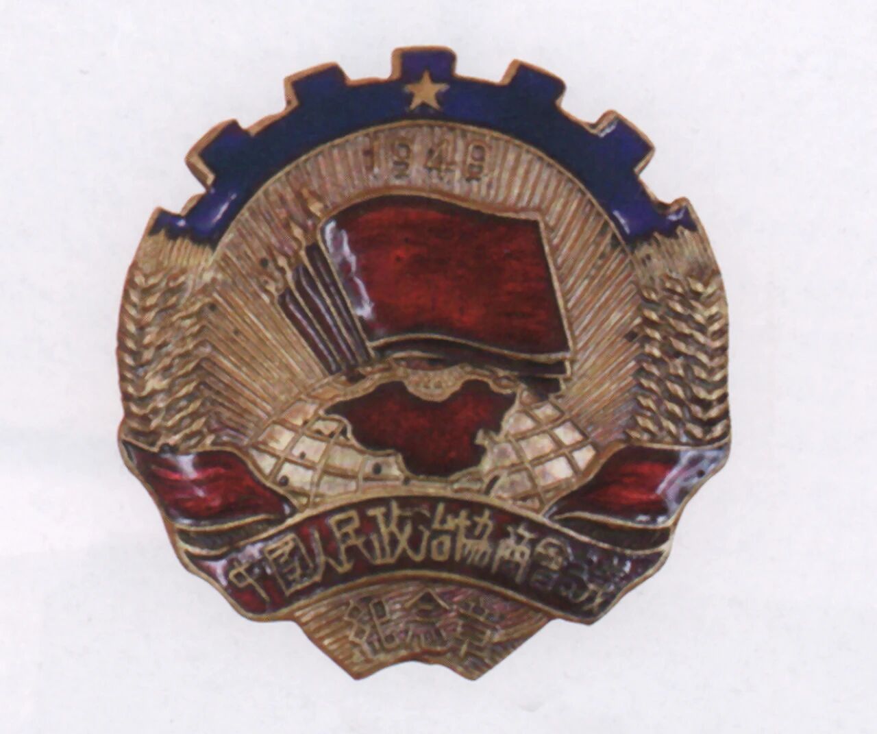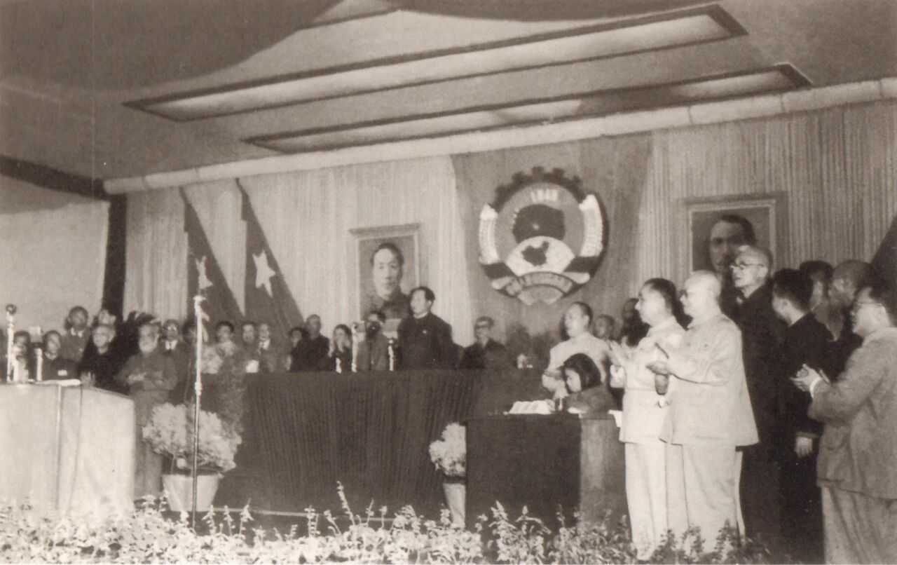 △1949年9月21日,中国人民政治协商会议第一届全体会议正式开幕前,89名主席团成员在主席台上。 18分钟开幕辞41次掌声 记者魏廉对中国人民政治协商会议第一届全体会议开幕式记述得很详细:水银灯炫目地照射着,全体肃立,奏着解放军进行曲,场外一声声的礼炮,使每个人都提起一种庄严的责任感。忽然,几声霹雳,大地震动,门外大雨如注。正好像安排下的节目,有意宣示中华人民共和国在大雷雨中诞生。 1949年9月22日为这次大会特别印发的“会刊”,也刊登了这样的讯息:当被通过的主席团登上主席台后,主席毛泽东宣布中国人民政治协商会议开幕。在这个庄严的时刻,军乐队齐奏人民解放军进行曲,同时在会场外鸣礼炮54响,全场代表一致起立,热烈鼓掌至5分钟之久。 关于这一天的天气,竺可桢日记记有:九月二十一日,星期三,(北平)晨晴,下午晴,晚八时至八时廿分雨雹,继以雷雨。 黄炎培日记记有:是夜,大雷雨,会毕,雨歇了。 在雷雨和接连54响礼炮的巨大轰鸣声中,毛泽东迈着稳健的步子,走上了举世瞩目的中国人民政治协商会议的主席台。 毛泽东宣读了由他亲自起草的开幕辞:诸位代表先生们,全国人民所渴望的政治协商会议现在开幕了。 话音刚落,掌声如暴风震摇全场。魏廉在《新中国在雷雨中诞生——人民政协开幕观礼记》中写道: 在十八分钟的致辞中,获得掌声四十一次。几乎每一个小段,每一句话都引起一阵掌声。而在掌声间歇全场肃静的时候,便听到“中国人从此站起来了!” 如雷般的拍手,震撼着整个会场。 在毛泽东的开幕词宣讲完,在长时间掌声中结束后,全场起立为在人民解放战争和人民革命中牺牲的人民英雄们静默3分钟志哀。 两枚不同的徽章和纪念章 在中国人民政治协商会议第一届全体会议开幕前,大会会务组以精细的筹划,为与会代表做了各项准备。其中《代表手册》把大会进行时会前、会中、会后的细节全部包括,在发现一些问题后,及时给参会代表以解答和解决。实际上,与《代表手册》同时发给每位代表的,还有两枚“人民政协”会议纪念徽章。 中国人民政治协商会议第一届全体会议会徽的设计制作,是新政协筹备会召开后的一项重要工作。这项工作由新政协筹备会常委会副秘书长齐燕铭负责。1949年7月2日,秘书长办公室第5次工作会议上,决定将会徽设计工作交给中南海布置科科长兼中南海俱乐部主任钟灵同志负责,会议明确会徽的含义为:“无产阶级所领导的以工农为基础的民主阶层大团结”。在钟灵同志的直接组织下,新政协会徽图案选定了由刚从东北调到华北大学三部美术系的张仃教授、国立北平艺术专科学校周令钊老师设计的由红星、齿轮、嘉禾、红旗和中国地图等构成的图稿。经几次反复修改,在得到毛泽东、周恩来、朱德和一些民主人士的认可后,最终完成中国人民政治协商会议第一届全体会议会徽的设计与制作。