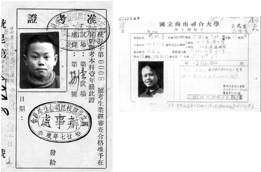 △杨振宁西南联合大学准考证(左)、学籍卡(右)。 1945年,杨振宁作为第六届清华大学留美公费生赴美留学,就读于芝加哥大学。1948年,他以论文《论核反应和符合测量中的角分布》在芝加哥大学获博士学位,导师是泰勒教授。毕业后,他在芝加哥大学工作。在芝加哥大学期间,杨振宁与物理学大师费米教授交往密切,受到费米的很大影响。1949年,在费米和泰勒两位著名物理学家的推荐下,杨振宁加入普林斯顿高等研究院任研究员,从此开启了辉煌的学术生涯。1952年他任永久研究员,1955年任教授。