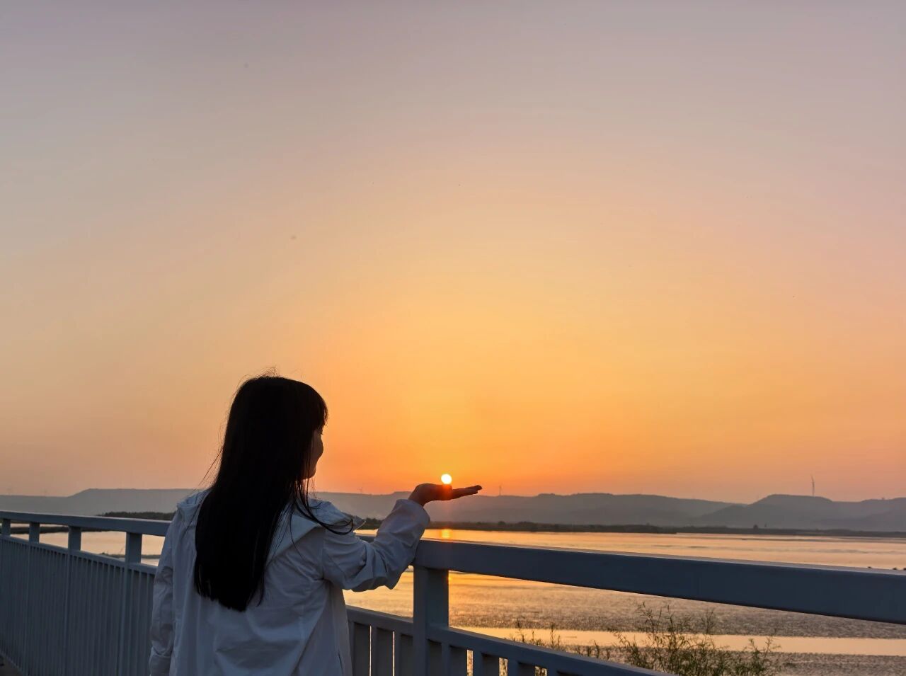 驱车一个小时后,我们到达了黄河吴王浮桥渡口。老公把车稳稳地停在路边,我俩准备下车好好逛逛。刚一下车,眼前的景象瞬间让我屏住了呼吸。远处的黄河水面波光粼粼,好似有人在上面撒了数不清的碎金子,一闪一闪的,迷人极了。我忍不住拉着老公的胳膊,兴奋地指着水面喊:“你看,好漂亮啊!”老公笑着顺着我的手看过去:“是挺美的,咱今天可算来对了。”抬头望向天空,那简直是一幅巨大无比的画布。天空被染上了淡淡的橙红色,温柔得如同妈妈轻抚我脸颊的手,梦幻得好似仙女不小心洒下的颜料。随着时间的推移,太阳像个调皮的孩子,慢慢往西边沉下去。天空的颜色也渐渐变化,橙红色越来越浓,最后变成了鲜艳的红色,与那片蓝色的天空相互交织,宛如一幅绝美的画卷在我眼前徐徐展开。那光芒洒在水面上,整个水面都变成了一片燃烧的火海,壮观得让我忍不住张大了嘴巴。