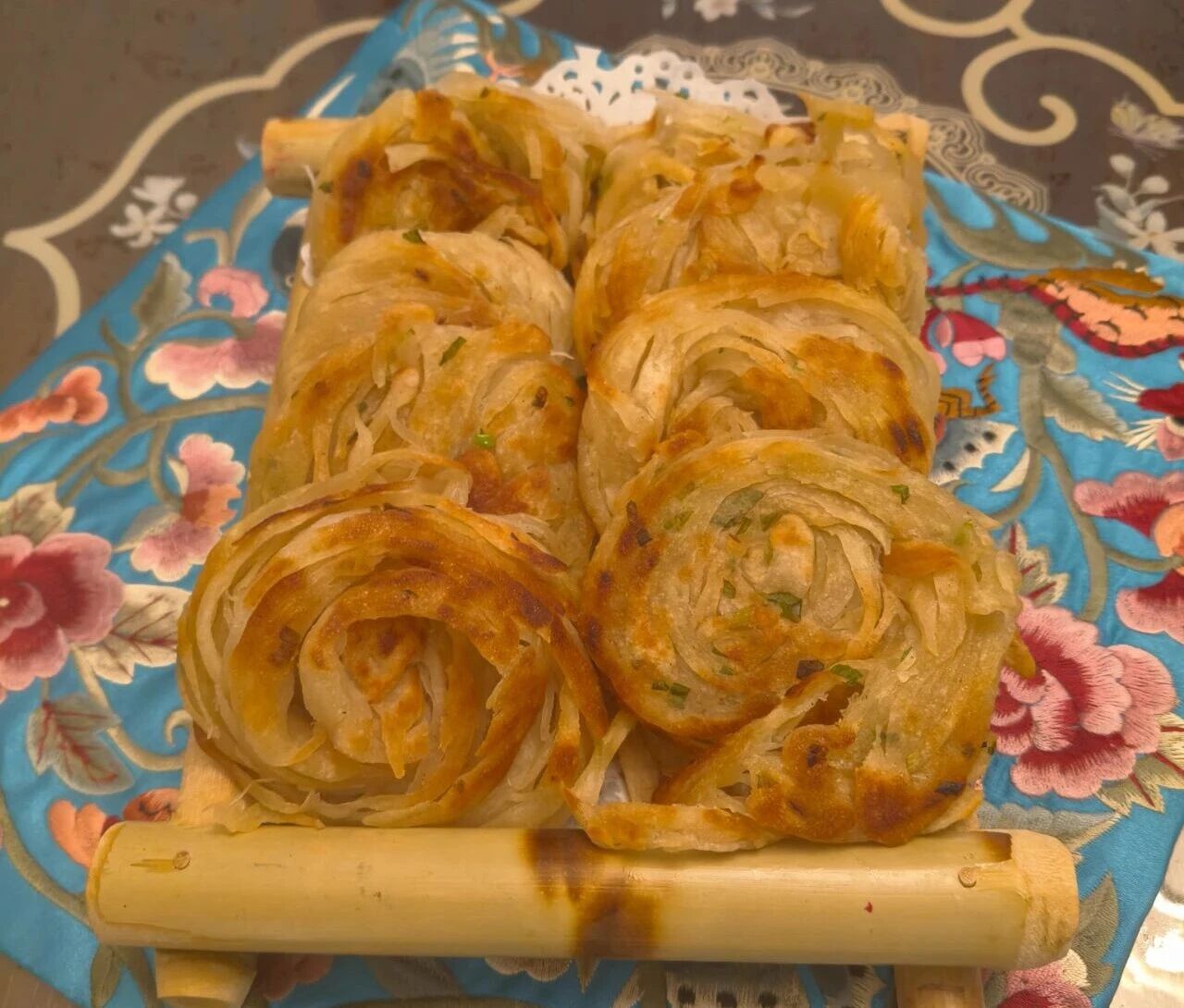 把刷好油的面片卷起来、折好,顺着45度角斜切成细条,每六七根拧成一个生胚,放一旁松弛几分钟,让椒香、盐味、油润和葱鲜慢慢融到一起。电饼铛预热刷油,放进擀好的生胚,每五分钟翻一次面,多翻两次,等烙到两面金黄,就能出锅了。再炒上几个家常菜,这顿饭就算齐活了。