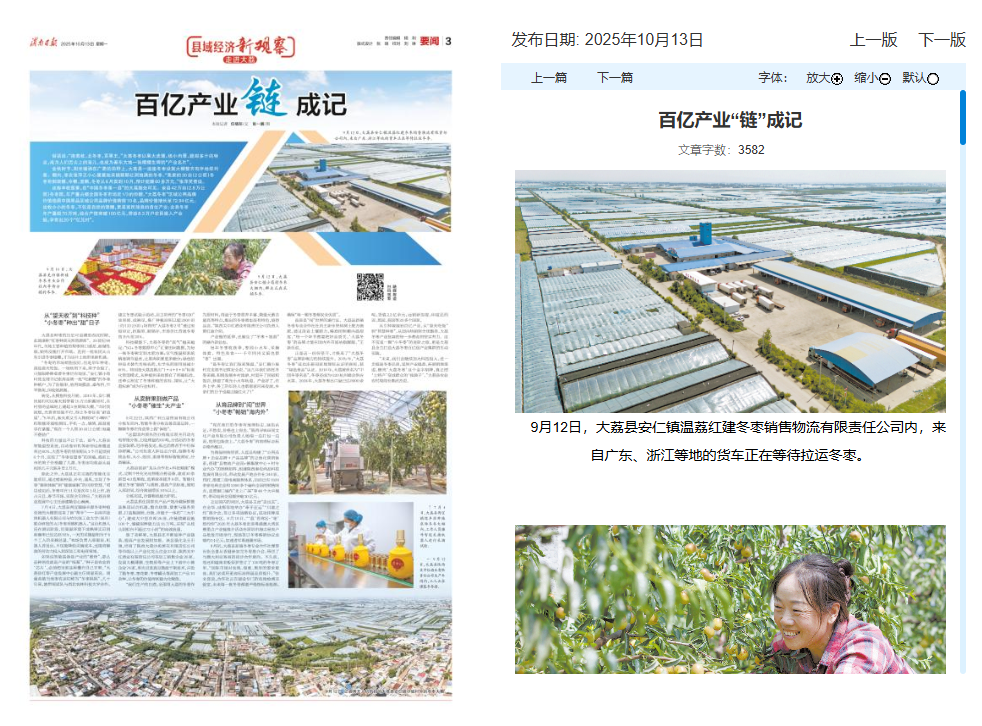 “冬枣的市场销售很好,但是早年种枣,真是看天吃饭。一场秋雨下来,果子全裂了,只能眼睁睁看着冬枣烂在地里。”安仁镇小荀村党支部书记张涛是第一批“吃螃蟹”的冬枣种植户,为了防裂果,他用地膜盖、桌布挡、竹竿搭架,但收效甚微。 转变,从拥抱科技开始。2010年,安仁镇伏坡村村民秦天琪带着15万元积蓄回村,在村里的盐碱地上建起3座钢架大棚。“当时我就想,光靠老经验不行,得让冬枣住进‘舒适屋’。”5年后,秦天琪又引入物联网“小喇叭”和智能环境检测仪,手机一点,墒情、温湿度尽在掌握,“现在一个人管30亩(2公顷)地毫不费劲!” 科技的力量远不止于此。如今,大荔县智能温控系统、自动卷帘机等新型设备覆盖率达60%,大荔冬枣的货架期从1个月延续到6个月,实现了“冬枣变夏枣”的突破,提前上市的果子价格翻了几番,冬枣亩均收益从最初的几千元跃升至2万元。 除此之外,大荔县正在实施的智能化实验项目,通过精准控温、补光、通风,实现了冬枣“强制休眠”到“健康破眠”的可控管理。“项目成功后,冬枣可在11月至次年1月上市,抢占元旦、春节市场,实现全年供应。”大荔县果业发展中心主任游建敏信心满满。 7月4日,大荔县两宜镇绿丰源冬枣种植农场的大棚里迎来了新“帮手”——由深圳蓝侠机器人有限公司与哈尔滨工业大学(深圳)联合研发的AI冬枣采摘机器人。“这台机器人还在测试阶段,但高温环境下成熟果实识别准确率已经达到92%,一天的采摘量相当于5个工人的采摘总量。”农场负责人薛康说,机器人普及后,不仅能降低采摘成本,还能将解放的劳动力投入到深加工和电商领域。 如果说智能装备是产业的“筋骨”,那么品种培优就是产业的“根基”。“种子是农业的‘芯片’,必须把当家品种攥在自己手里。”大荔县红枣产业发展中心副主任周爱英说。周爱英被当地枣农亲切称为“冬枣妈妈”,几十年来,她带领团队与西北农林科技大学合作,建立冬枣试验示范站,自主培育的“冬枣820”坐果易、成熟早,推广种植面积已超2000亩(约133公顷);培育的“大荔冬枣2号”通过省级审定,抗裂果、耐储存,市场价比普通冬枣高15%至20%。 科技赋能下,大荔冬枣的“底气”越来越足:“5G+冬枣数据中心”汇聚田间数据,为每一株冬枣树定制水肥方案;空气能温控系统精准调节温差,让果肉积累更多糖分;绿色防控技术替代传统农药,化学农药使用量减少60%。特别是大荔县推出“1+4+8+N”标准化管理模式,从种植到采收都有了明确标准,还牵头制定了冬枣种植的省标、国标,让“大荔标准”成为行业标杆。 9月22日,陕西广利五益贸易有限公司分拣车间内,智能冬枣分拣设备高速运转,一颗颗冬枣在传送带上做“体检”。 “这套国内领先的分拣线实现全自动光电智能分拣,日处理量约60吨,分选后的冬枣直接装箱,经冷链发送,抵达消费者手中仍保持鲜嫩。”公司负责人钟远志介绍,每颗冬枣按品相、大小、级别、重量等指标智能测定,分类输送。 大荔县创新“龙头合作社+科技赋能”模式,定制个性化光电智能分拣设备,建成30条新型4.0选果线,选果效率提升6倍。智能化测定冬枣“颜值”与规格,提高产品标准,缩短入库时间,综合效益增长10%以上。 大荔县抓住国家农产品产地冷藏保鲜整县推进试点机遇,整合政策、要素与服务资源,打造集展销、分拨、冷链于一体的“三大中心”,建成大中型冷库25座、冷链储藏设施108个,储藏保鲜能力达15万吨,实现“从枝头到柜台不超过72小时”的高效流通。 除了卖鲜果,大荔县还不断延伸产业链条,提高产业发展附加值。该县强化龙头引领,培育了陕西大荔沙苑黄花有限责任公司等市级以上产业化龙头企业23家、陕西关中红酒业有限责任公司等加工销售企业26家,发展大棚薄膜、生物质等产业上下游中小微企业74家,率先引进真空微波干制技术,开发了脆冬枣、枣花蜜、冬枣罐头等深加工产品10余种,让冬枣的价值得到最大化释放。“我们生产的白酒,全部用大荔的冬枣作为原材料,得益于冬枣营养丰富、微量元素含量高等特点,酿出的冬枣酒也很有特色,值得品尝。”陕西关中红酒业有限责任公司负责人黄红波介绍。 产业链的延伸,还催生了“冬枣+旅游”的融合新业态。 每年冬枣收获季,枣园小火车、采摘体验、特色美食……千年同州文旅也借“枣”出圈。 “是冬枣让我们发家致富。”安仁镇小坡村党支部书记薛安全说,“这几年我们依托冬枣采摘,积极发展乡村旅游,村里开了民宿和饭店,修建了观光小火车轨道。产业好了,在外上学、务工的年轻人也都愿意回来发展,乡亲们的日子也越过越红火了!” “现在我们的冬枣有地理标志、绿色认证,不愁卖,价格也上得去。”陕西寻味田间文化产业有限公司负责人杨瑞一边打包一边说,他的包装盒上,“大荔冬枣”的地理标志标识格外醒目。 为做强销售经营,大荔县构建了“公用品牌+企业品牌+产品品牌”的立体化营销体系,搭建“县物流产业园+镇集散中心+村专业代办”的销售矩阵,组建陕西秦农尚品科技发展有限公司,带动发展产地合作社344家。同时,搭建三级电商服务体系,目前已有1500余家电商企业和1000多个遍布全国的销售网点,直营窗口遍布“北上广深”等40个大中城市,带动电商交易额突破30亿元。 立足国内的同时,大荔县主动“走出去”,在金华、成都等地举办“牵手