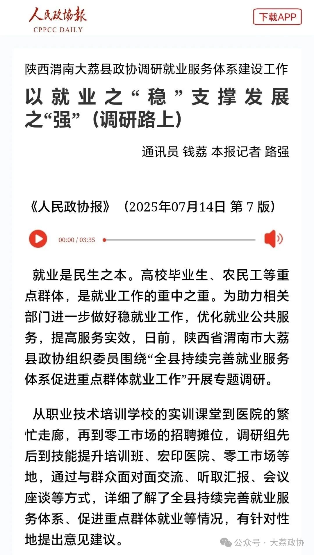 就业是民生之本。高校毕业生、农民工等重点群体,是就业工作的重中之重。为助力相关部门进一步做好稳就业工作,优化就业公共服务,提高服务实效,日前,陕西省渭南市大荔县政协组织委员围绕“全县持续完善就业服务体系促进重点群体就业工作”开展专题调研。 从职业技术培训学校的实训课堂到医院的繁忙走廊,再到零工市场的招聘摊位,调研组先后到技能提升培训班、宏印医院、零工市场等地,通过与群众面对面交流、听取汇报、会议座谈等方式,详细了解了全县持续完善就业服务体系、促进重点群体就业等情况,有针对性地提出意见建议。 “咱大荔冬枣甜透全国,黄花菜香飘万里,这就是天然的‘金字招牌’。”在大荔县华鑫职业技术培训学校旁听了电商运营课后,宫敏委员表示,农村新产业新业态的发展,极大拓展了乡村就业空间,为人才在当地就业提供了更多新机遇。她建议可以通过开设“土特产营销实战班”,把龙头企业的带货能手请来讲课,让乡亲们结业就能吃上“电商饭”,让大荔特产走进千家万户。 “要以特色产业为纽带,打造‘合作社+农户+企业’就业共同体,让乡亲们实现‘从田间到车间’的身份转变,让他们在家门口增收致富。”程春宁委员补充道。 走进宏印医院,当了解到护理人才短缺的现状时,王向阳委员提出,要充分依托周边城市,如西安、渭南的医学资源优势,搭建“校院直通车”,通过定向培养方式,为当地输送护理人才。 在大荔县零工市场,员建龙委员详细了解零工市场运营模式后,提出了搭建线上“零工超市”的新思路。利用互联网技术,让找活、谈价、结账等流程在手机上就能完成,并联合司法部门设立“维权驿站”,保障打零工群体的合法权益。 在随后召开的座谈会上,代东娥委员说,要以产业拓宽就业空间,通过大力推进产业结构升级来扩大就业容量。小微企业是吸纳就业的主力军,要构建“政策扶持+金融支持+要素保障”三位一体服务体系,通过降低企业融资成本、盘活闲置厂房资源,助力企业轻装上阵、扩大用工规模。 李艳红委员重点关注就业困难群体服务个性化问题。她建议,依托大数据精准识别就业困难人员,量身定制“岗位推介+技能培训+心理疏导”帮扶方案,确保“弱有所扶、困有所助”。 参加调研的县政协副主席李耀武表示,要准确把握形势,从全力拓岗位扩容量、优环境促创业、解难题稳企业、保重点兜底线、抓培训促提升等方面发力,牢牢压实工作责任。要进一步强化责任,动员各方力量形成稳就业工作合力,以就业之“稳”支撑经济发展之“强”,切实保障民生就业工作稳步推进。