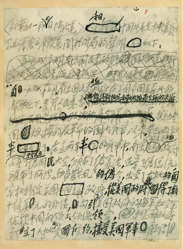 △1949年1月14日,毛泽东主席起草的关于时局的声明的电报手稿。 到达解放区的各民主党派、各人民团体的代表人物及无党派民主人士李济深、沈钧儒、谭平山、郭沫若等55人,经过广泛沟通和深入讨论,于1月22日联合发表声明,拥护毛泽东提出的八项条件。声明强调:“愿在中共领导下,献其绵薄,共策进行,以期中国人民民主革命之迅速成功,独立、自由、和平、幸福的新中国之早日实现。”这是各民主党派和无党派民主人士第一次以书面形式明确地公开宣布自愿接受中国共产党的领导,是各民主党派和无党派民主人士政治立场彻底转变的重要标志。
