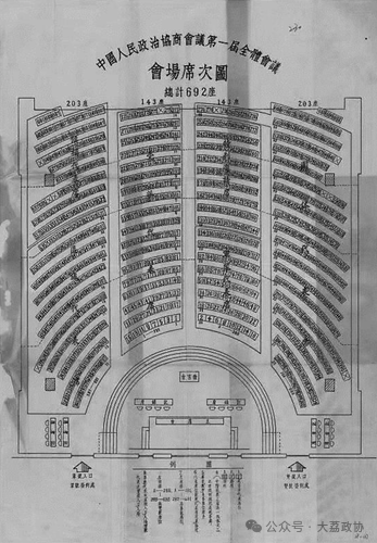 《中国人民政治协商会议第一届全体会议会场席次图》 会议代表席次表 中国人民政治协商会议第一届全体会议召开期间,大会秘书处绘制《中国人民政治协商会议第一届全体会议代表席次表》,大会新闻处编印了《中国人民政治协商会议第一届全体会议会刊》等作为会议材料,分发给参会代表、会务工作人员。中国人民政治协商会议第一届全体会议结束后,张敦礼将这些承载了人民政协历史记忆的珍贵文献,细心地保存了起来。 《中国人民政治协商会议第一届全体会议代表席次表》,长12.8厘米,宽19.2厘米,席次表中记载了参加中国人民政治协商会议第一届全体会议各单位代表的席次号数;席次表后附席次图,该图纸张已磨损泛黄、并有穿孔和折痕;席次图直观地反映了当时中国人民政治协商会议第一届全体会议会场情况,以及参加会议的党派、区域、军队、人民团体、特别邀请等代表的分布席次。 通过《中国人民政治协商会议第一届全体会议会场席次图》可以看出,中国人民政治协商会议第一届全体会议会场共692座,其中左右单双两席次各有346座,席次图下方是发言台,单双入口分别配备签到处。席次图从右往左,第一列是团体代表席、第二列是特别邀请席和军队代表席、第三列是党派代表席、第四列是区域代表席和候补代表席,毛泽东同志当时就坐在党派代表席(从右往左第三列)面朝发言台的第1号位置。 在这份席次图中也体现出此次会议代表范围包括一切为建立新中国而奋斗的各界人士及对和平解放有功人员,会场席次的设计也充分考虑到了这方面因素,体现了中国革命的大团结。如党派代表席次中,从下至上依次是中国共产党、中国国民党革命委员会、中国民主同盟、民主建国会、中国民主促进会、中国农工民主党、中国人民救国会、三民主义同志联合会、中国国民党民主促进会、中国致公党、九三学社等党派代表席次。军队单位高级领导较少,在代表名额的选举以及座次的排序时尽量照顾到兵团的指战员,战斗英雄及后勤卫生人员、起义官兵人员。同时也照顾到各地区、待解放区以及海外华侨、少数民族、宗教界、自然科学、社会科学、文学艺术等方面的代表及就座席次。 《中国人民政治协商会议第一届全体会议会场席次表》生动见证了中国人民政治协商会议第一届全体会议的各单位及代表组成情况,通过这件文物可以感受当时的大会盛况以及在场每一位代表为新中国即将诞生而洋溢的喜悦心情。