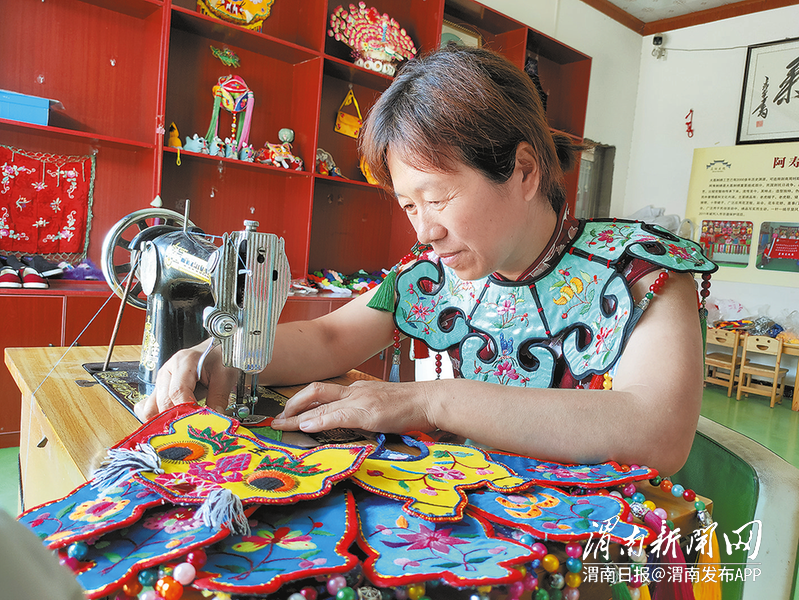 每年春节、元宵节或“二月二”,大荔县阿寿村社火队伍中,花苫鼓舞最为动人。村里的姑娘们身披精美刺绣服饰,在铿锵鼓点中如彩蝶翻飞,服饰上的一针一线都凝聚着匠心与热爱,仿佛在诉说着一个个动人的故事。村里谁家有喜事,门楣上高悬的“门彩”更是不可或缺。“挂上它,就觉着喜气进门了。”8月1日,记者走进大荔县阿寿村“新丽刺绣非遗工坊”,非遗代表性传承人王新丽笑语中满是骄傲。